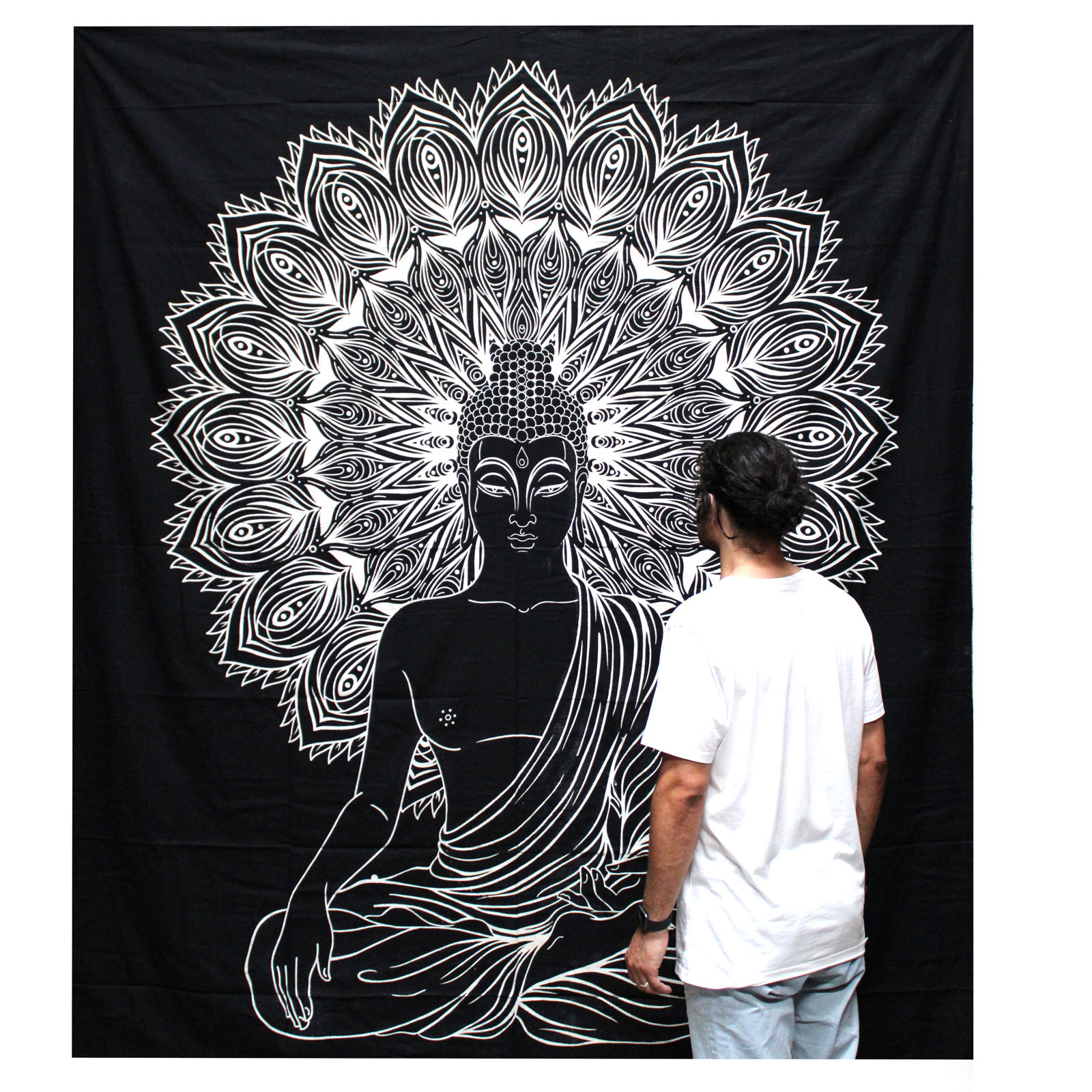 Double Cotton Bedspread / Wall Hanging - Buddha B&W as a bestowal selection is an absolute must for that special someone in your life. This Black and White Double Cotton Bedspread Wall Hanging is a real works of art. Full of symbolic meanings taken from ancient Indian traditions, the design is printed by hand so minor imperfections can occur. Do not confuse with cheap mass produced machine printed items. These designs are in Black and White colours, great quality and beautifully designed. Due to its unique and handmade nature, the measurements may vary a little. Material: 100% Cotton - Made in India Size : Height: 230 cm length: 200 cm We highly recommend exploring our collection of products in this this