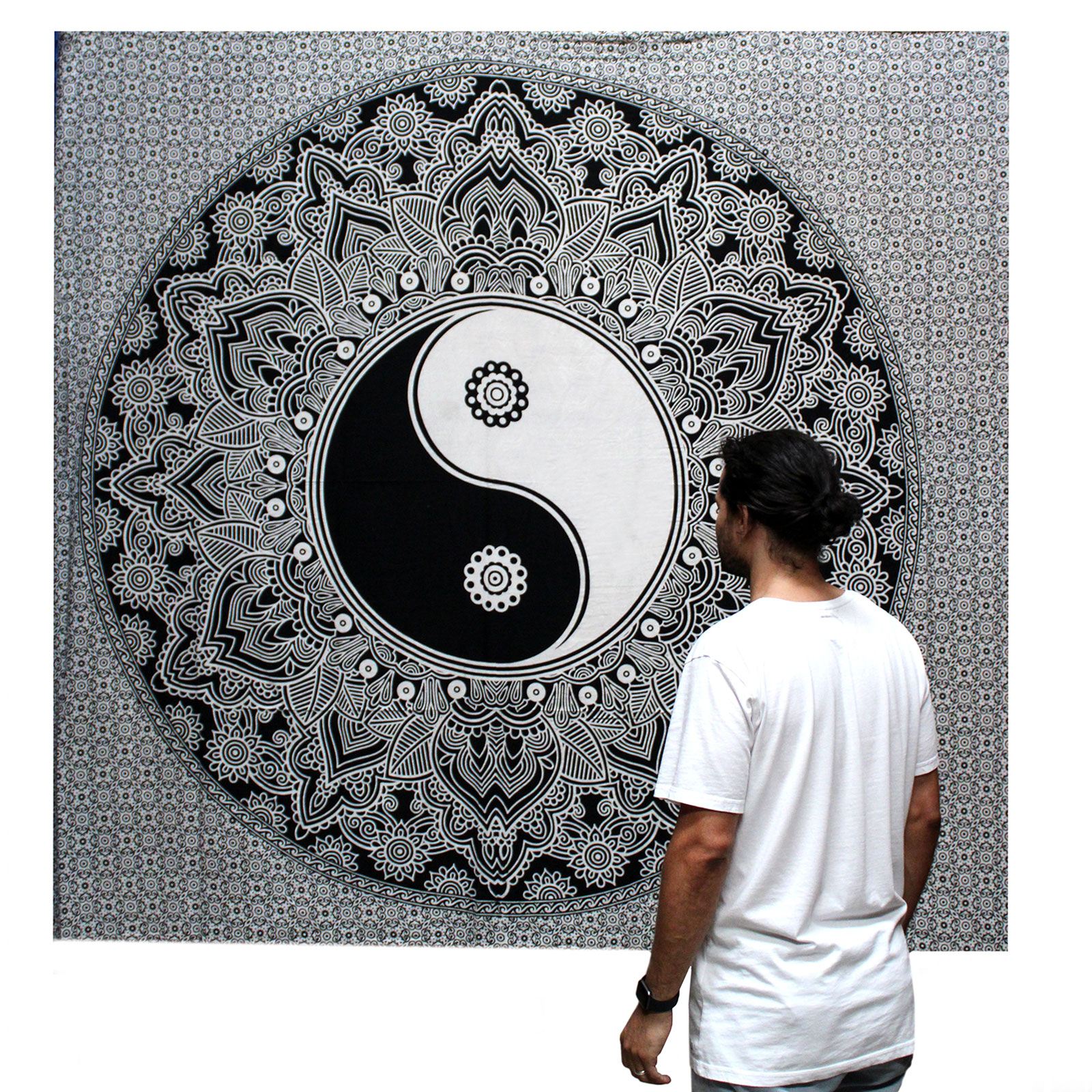 Double Cotton Bedspread / Wall Hanging - Ying yang B&W selection of as a gifts would be ideal for your partner. This Black and White Double Cotton Bedspread Wall Hanging is a real works of art. Full of symbolic meanings taken from ancient Indian traditions, the design is printed by hand so minor imperfections can occur. Do not confuse with cheap mass produced machine printed items. These designs are in Black and White colours, great quality and beautifully designed. Due to its unique and handmade nature, the measurements may vary a little. Material: 100% Cotton - Made in India Size : Height: 230 cm length: 200 cm You wouldn't want to miss out on exploring our impressive collection of products in this this
